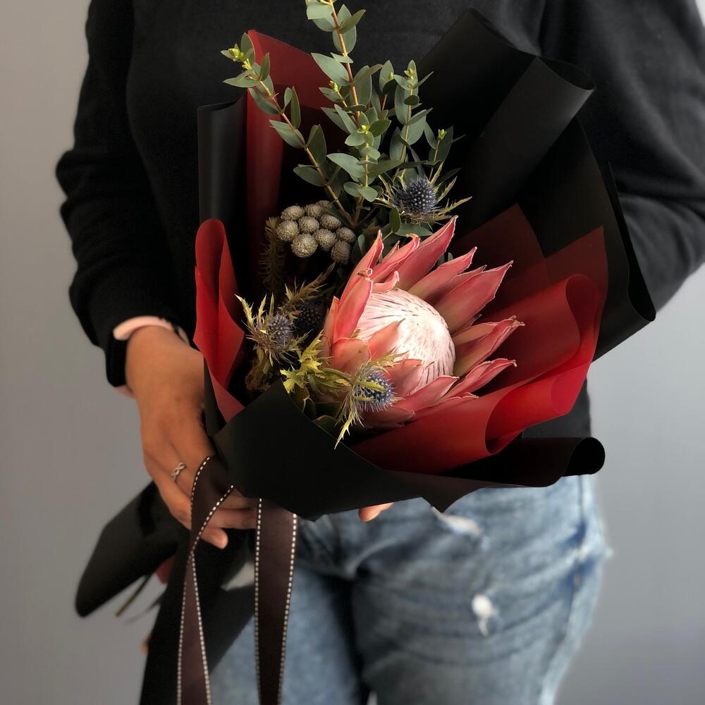 Протея – 1 шт.Бруния – 1 шт.Эвкалипт – 2 шт.Эрингиум – 1 шт.Упаковка дизайнерская – 2 шт.Лента атласная – 2 шт.