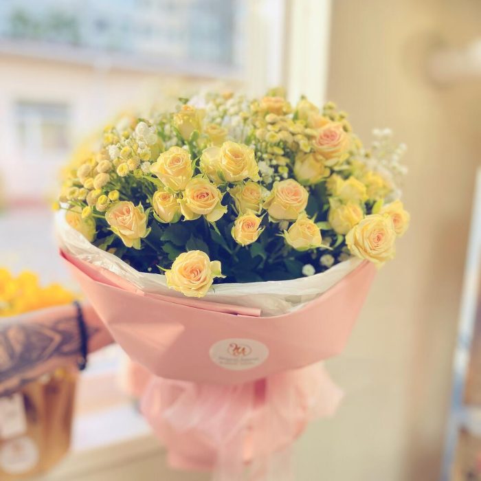 троянда спрей – 11 шт. гіпсофіла – 3 шт. сантіні мікс – 3 шт. оформлення букета в упаковка – 1 шт.