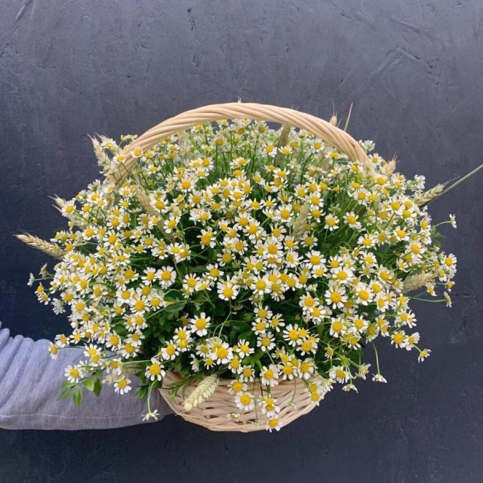 Корзина из ромашки (матрекарии), триникума, зелени «Летнее танго»