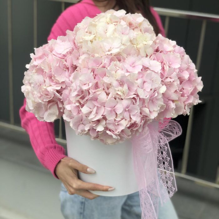 Оазис – 4 шт. Коробка – 1 шт. Оформление – 1 шт. Гортензия розовая – 5 шт.