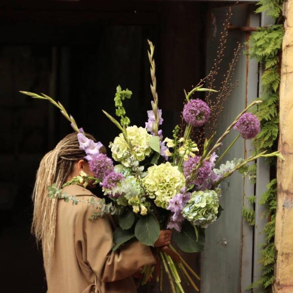 Гортензия – 5 шт.Аллиум – 5 шт.Гладиолус – 7 шт.Наперстянка – 5 шт.Лен – 3 шт.Эвкалипт – 9 шт.Лента – 1 шт.