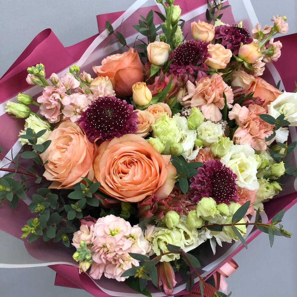 Альстромерия – 4 шт.Лизиантус – 4 шт.Маттиола – 4 шт.Озотамнус – 3 шт.Роза кустовая – 3 шт.Скабиоза – 4 шт.Эвкалипт – 4 шт.Роза – 5 шт.Гвоздика – 7 шт.Лента атласная – 1 шт.Упаковка дизайнерская – 1 шт.