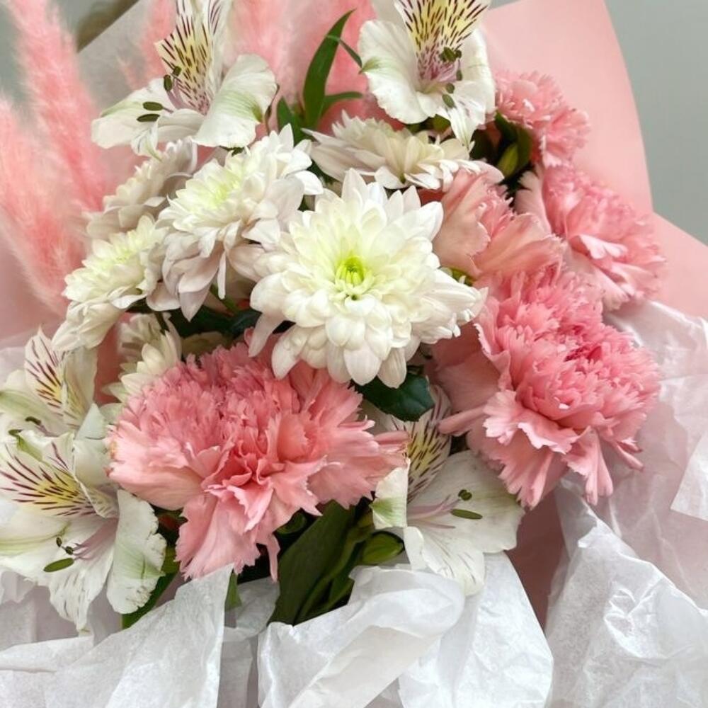 Диантус – 5 шт.Хризантема – 1 шт.Альстромерия – 2 шт.Помпасная трава – 5 шт.Тишью – 2 шт.Авторская упаковка – 1 шт.Лента атласная – 1 шт.