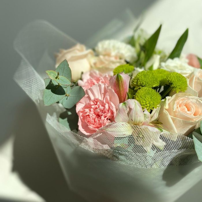 Альстромерия – 3 шт.Роза – 4 шт.Зелень – 5 шт.Упаковка – 7 шт.Гвоздика – 5 шт.Сантини – 1 шт.Фисташка – 6 шт.