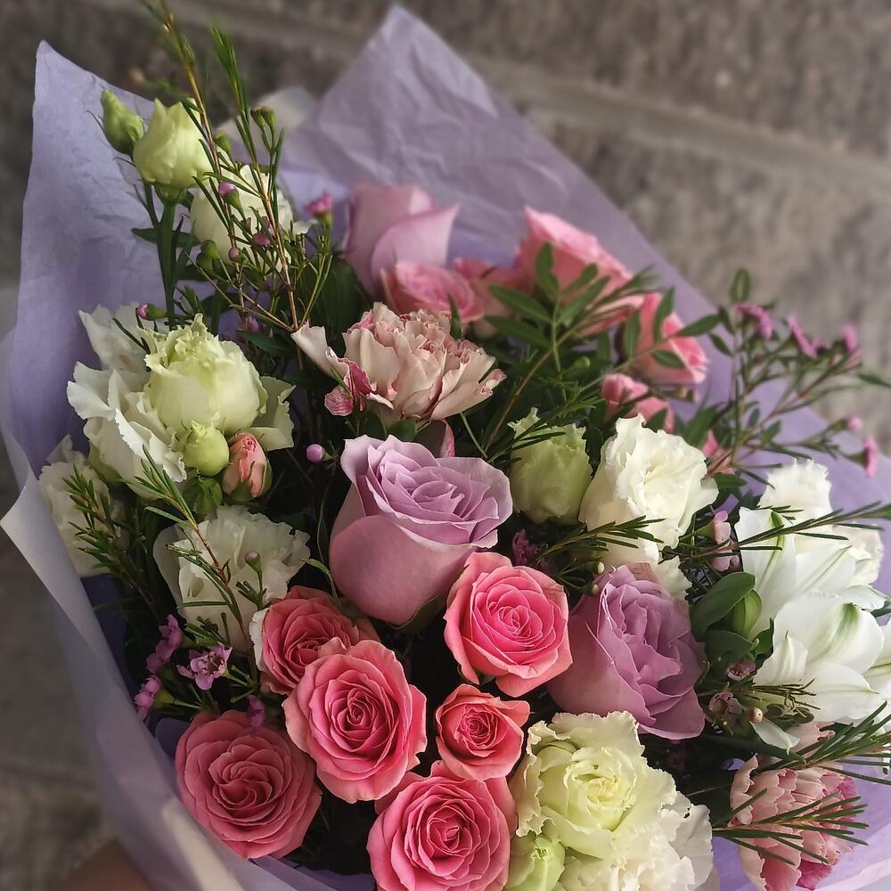 Категории: АльстромерииРозы, Гвоздики, Кустовые розы, Лизиантусы