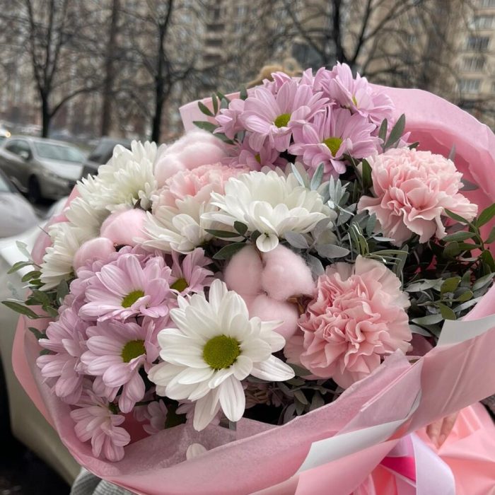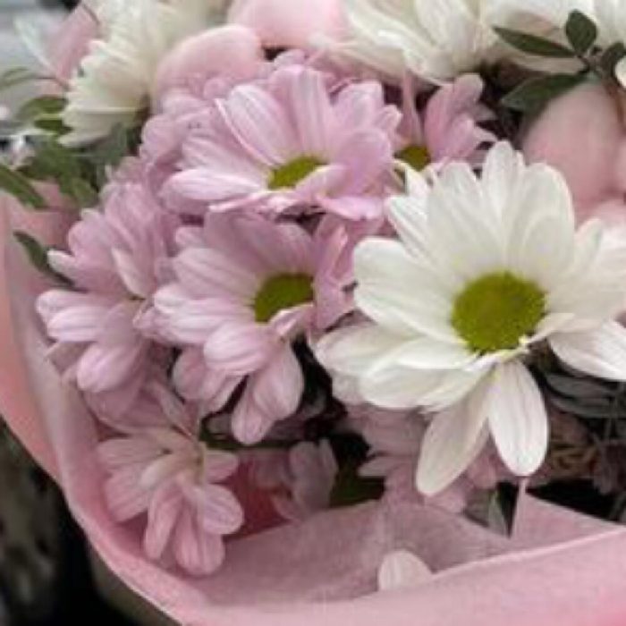 Нежный букет кустовых хризантем с хлопком, будет долго радовать ваших любимых Уважаемые покупатели! Пожалуйста обратите ваше внимание на размер букета при заказе! Он учитывается вместе с упаковкой Чтобы наши прекрасные букеты дольше радовали получателя рекомендуем вам: ⭐Обновить срез букета перед тем, как поставить его в воду⭐Ставить цветы в прохладную проточную воду ⭐Меняйте воду в вазу каждый день⭐Не забывайте подрезать цветы, перед тем, как ставить их в воду⭐Не ставить у отопительных приборов и на сквозняке Фирменный стиль наших букетов разработан специально так, чтобы упаковку не нужно было снимать, так как она придаёт целостность букету и прекрасно держится в вазе