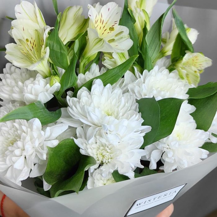 Альстромерия – 2 шт.Рускус – 3 шт.Хризантема кустовая – 2 шт.Лента атласная – 1 шт.Упаковка дизайнерская – 1 шт.