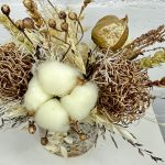 Колосья – 7 шт.Кашпо керамическое – 1 шт.Оазис флористический – 1 шт.Гелихризум – 3 шт.ларгус – 10 шт.гипсофила стабилизированная – 3 шт.леукондендрон – 2 шт.Хлопок – 3 шт.