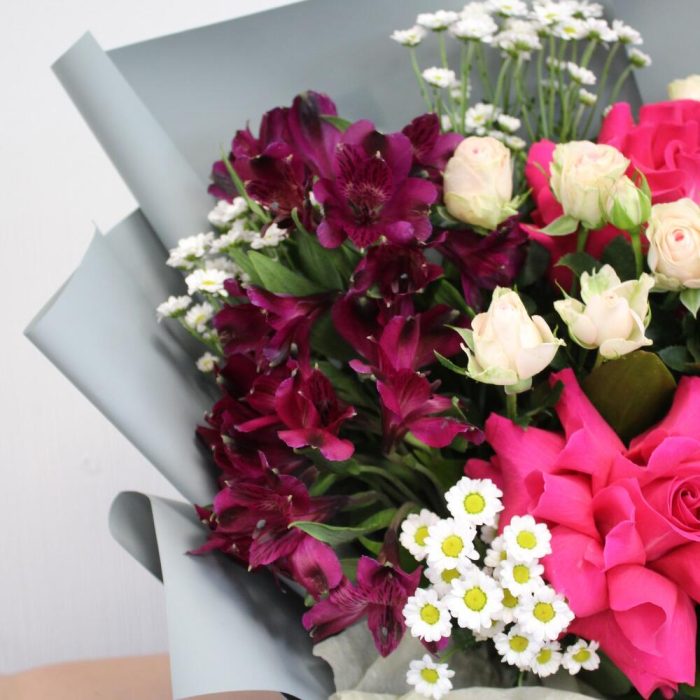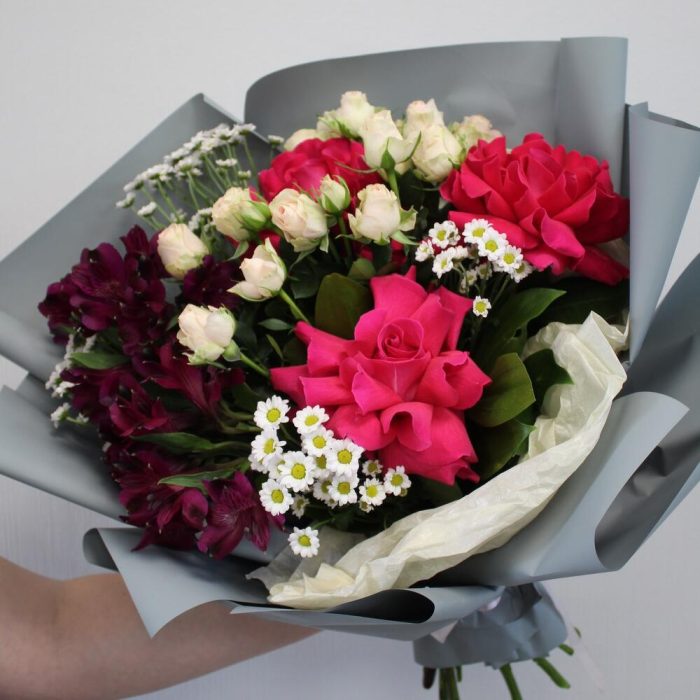 Альстромерия – 2 шт.Рускус – 1 шт.Сантини – 3 шт.Упаковка дизайнерская – 4 шт.Роза французская – 3 шт.Роза кустовая – 2 шт.