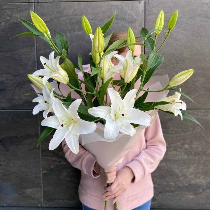 Лента атласная – 1 шт.Лилия белая – 3 шт.Упаковка дизайнерская – 4 шт.