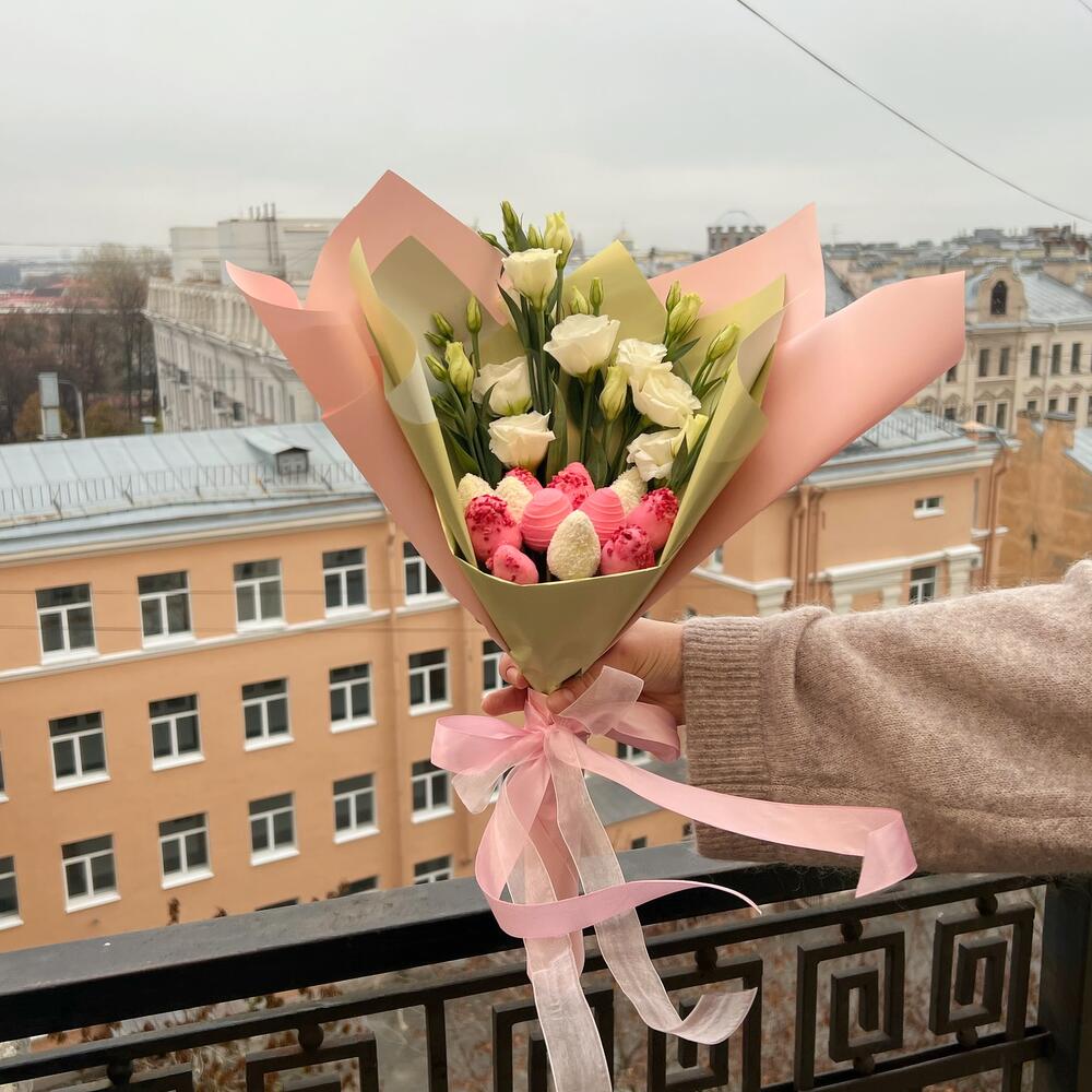 Упаковка – 1 шт.Белый лизиантус – 3 шт.клубника в бельгийском шоколаде – 300 гр.