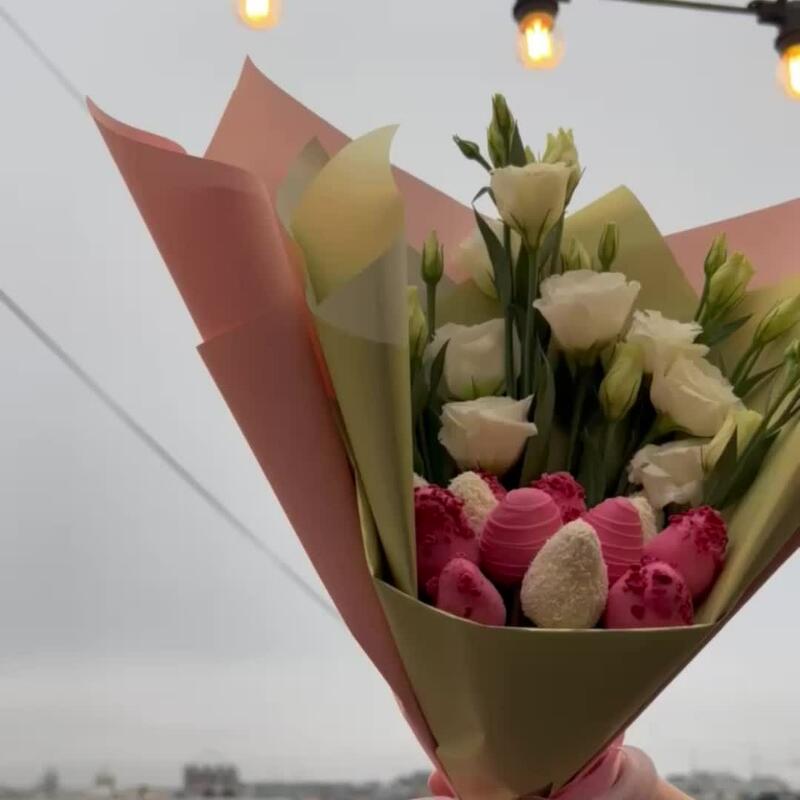 Букет из клубники в шоколаде с розовыми розами