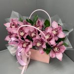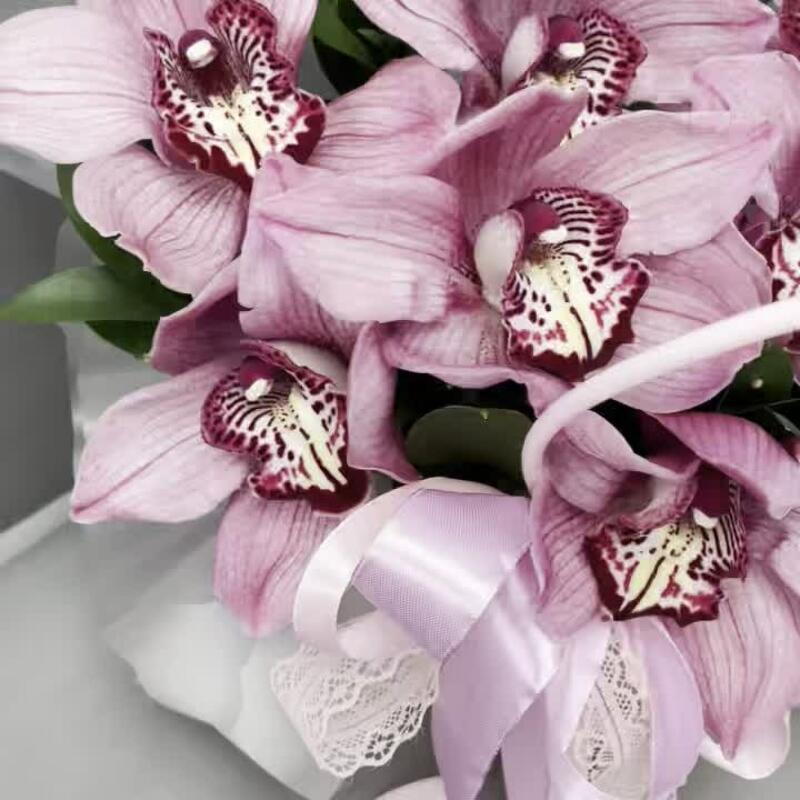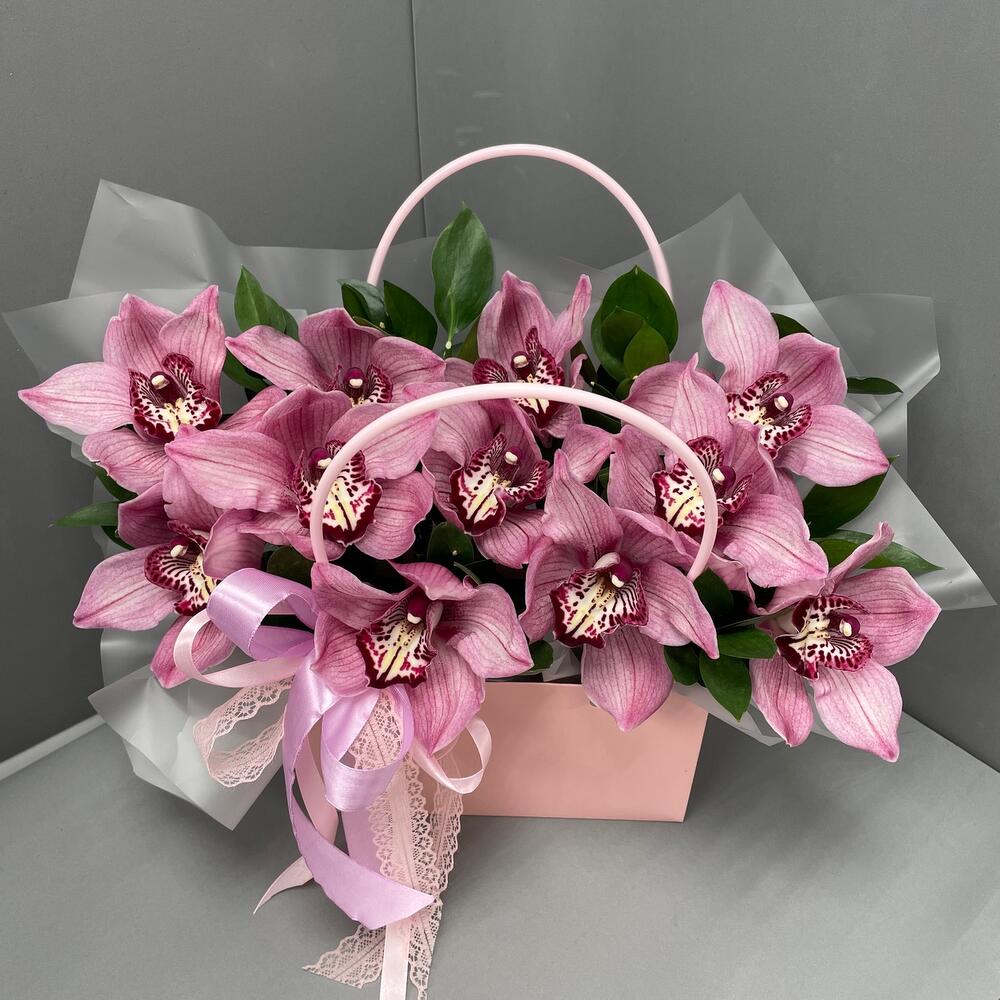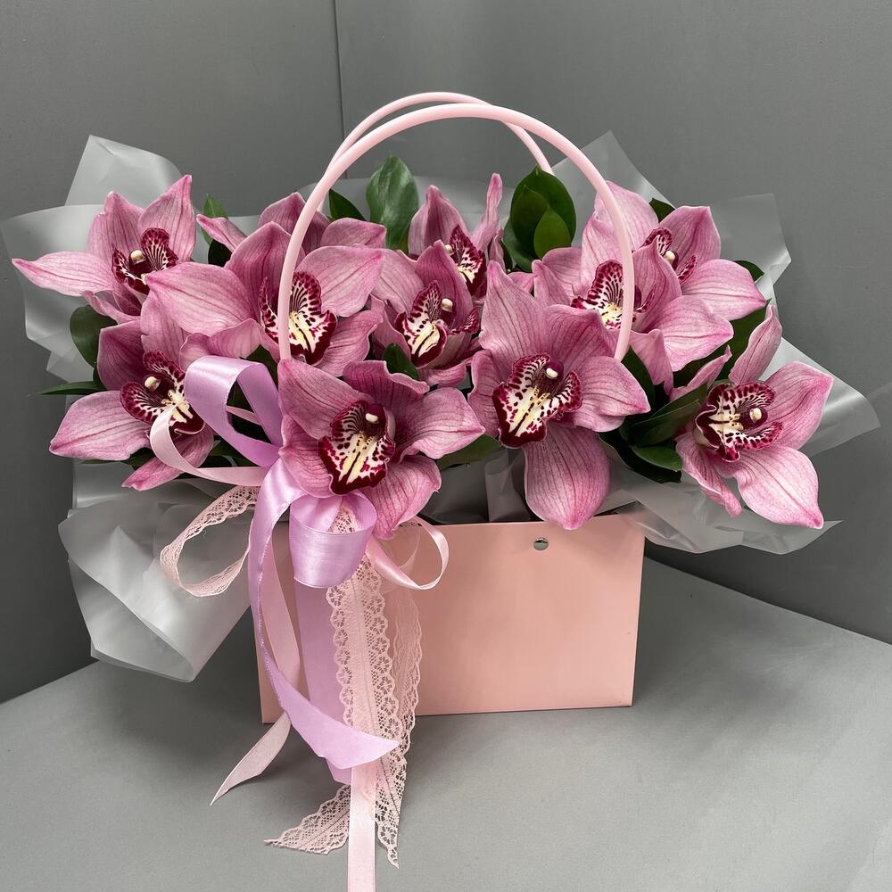 Орхидеи – 11 шт.Рускус – 6 шт.оазис флористический с водой – 1 шт.Сумочка – 1 шт.Оформление лента атласная – 1 шт.оформление лента кружево – 1 шт.