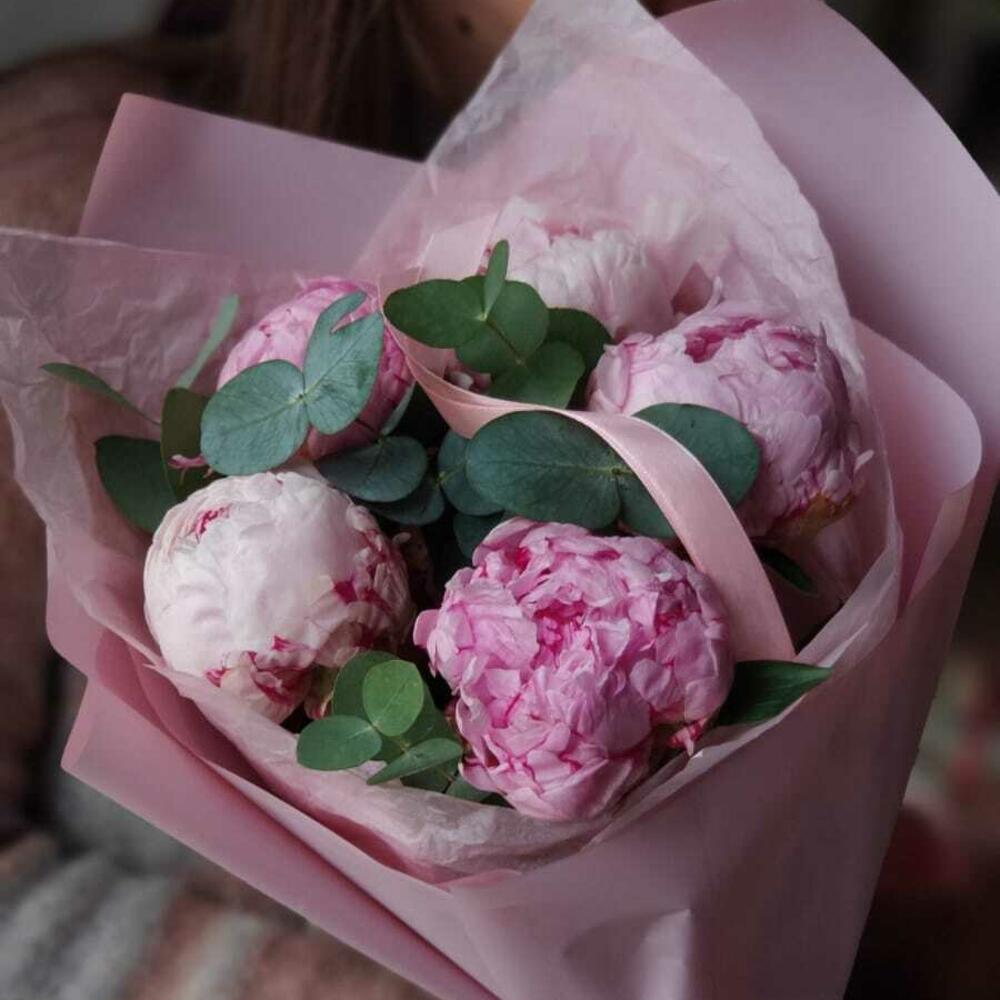 Пион – 5 шт.Эвкалипт – 1 шт.Упаковка – 1 шт.