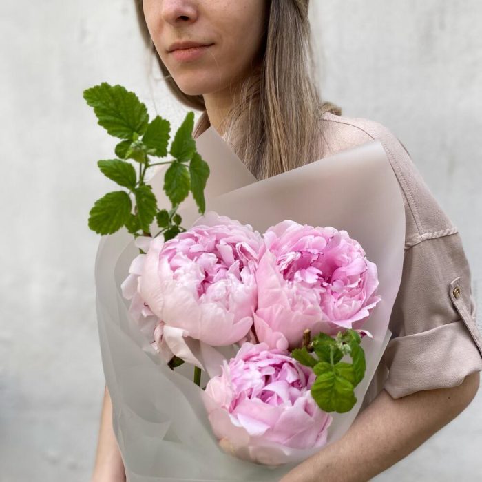 Пион Сара Бернар – 3 шт.ветка малины – 1 шт.Дизайнерская упаковка – 1 шт.