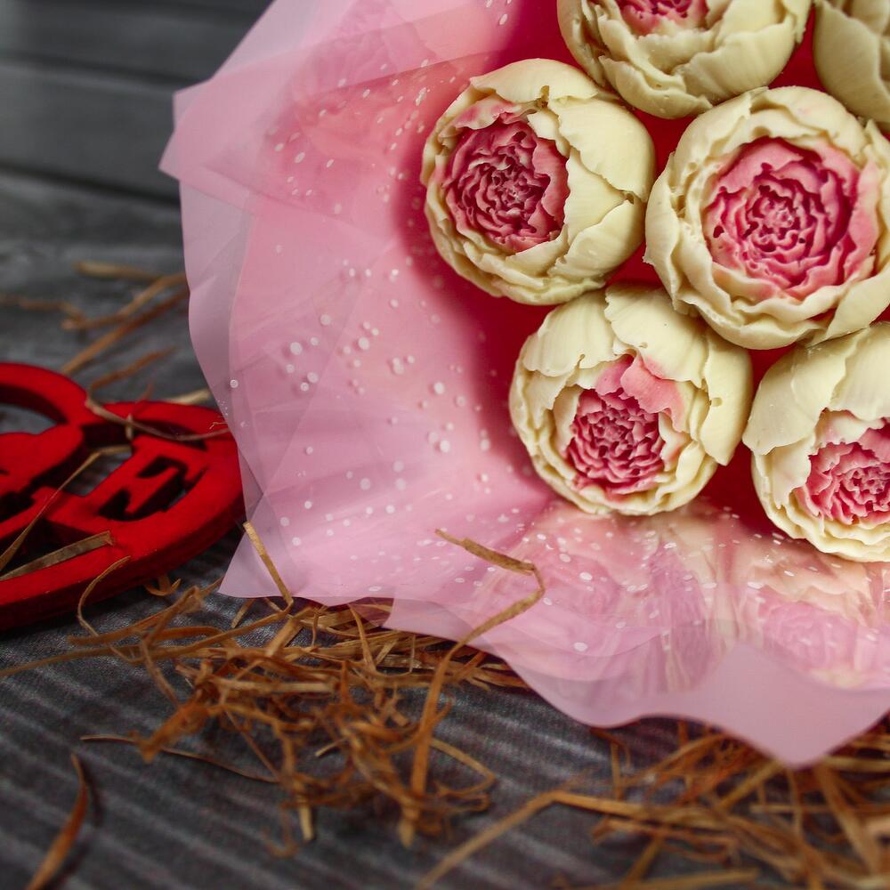Атласная лента – 1 шт.Прозрачная пленка – 1 шт.Авторская упаковка – 1 шт.шоколадные пионы из бельгийского шоколада – 7 шт.