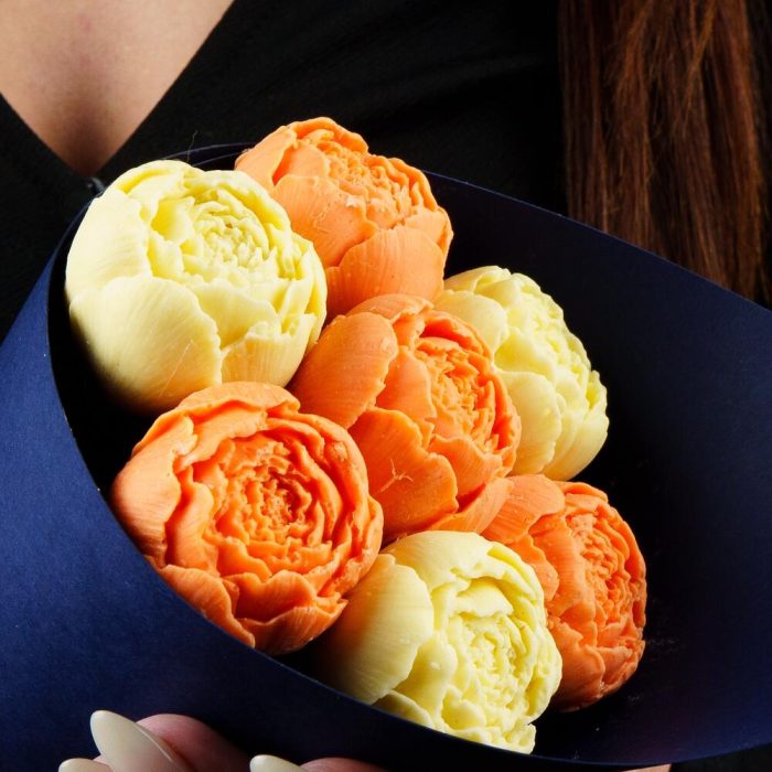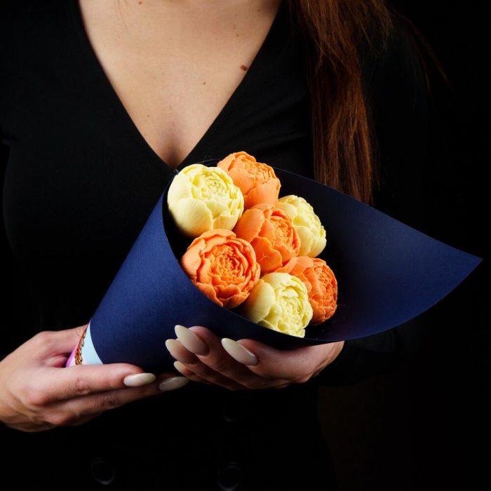 Букет из шоколадных пионов оранжево-сиреневый в дизайнерском картоне