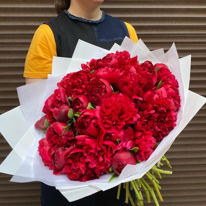 Лента атласная – 1 шт.Пион красный – 35 шт.Тишью белое – 2 шт.Пленка дизайнерская – 3 шт.