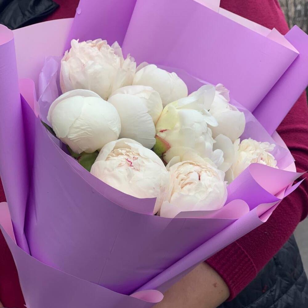 Пион белый – 9 шт.Упаковка дизайнерская – 1 шт.Лента атласная – 1 шт.