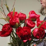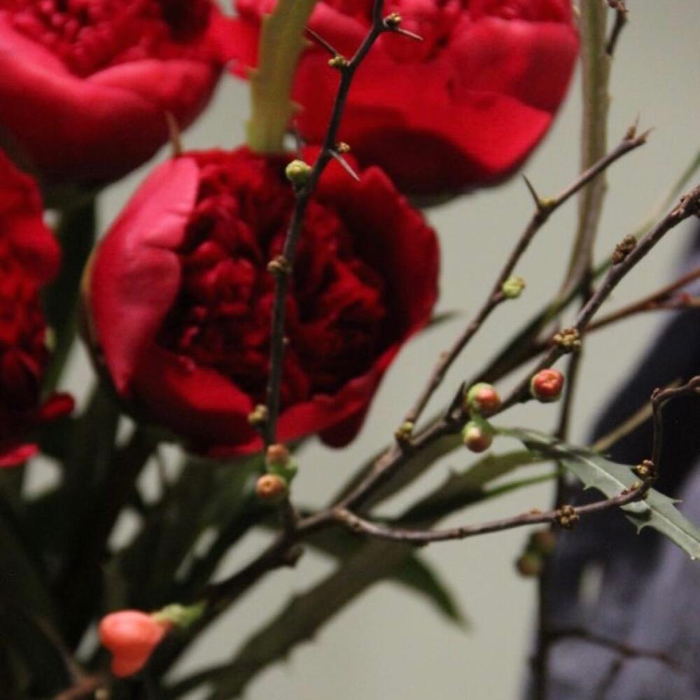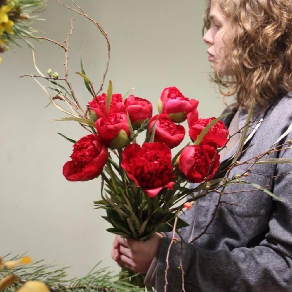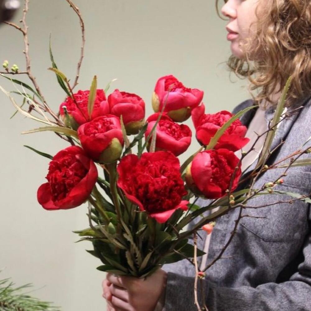 Яркий букет с пионами и ветвями.Букет приедет в подарочной коробке, с рекомендациями по уходу за цветами.При необходимости, если букет с нежными цветами или ему предстоит весомое время в дороге – то цветы мы отравляем на воде, останется лишь аккуратно снять кулёчек с водой и поставить букет в подходящую вазу.К каждому букету мы подписываем открытку с вашим посланием – эта услуга, так же в подарок.