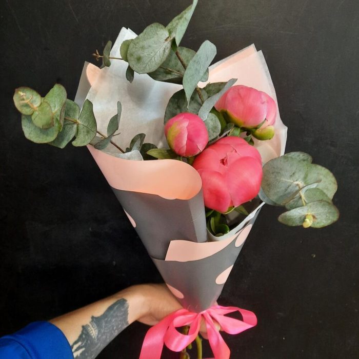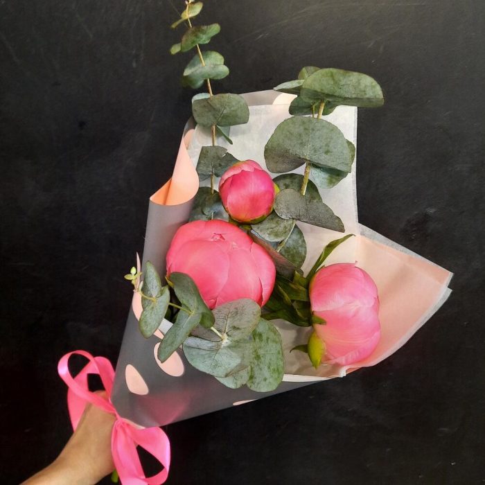 Пион Коралл Шарм (Coral Charm) – 3 шт.Эвкалипт – 1 шт.Упаковка дизайнерская – 1 шт.