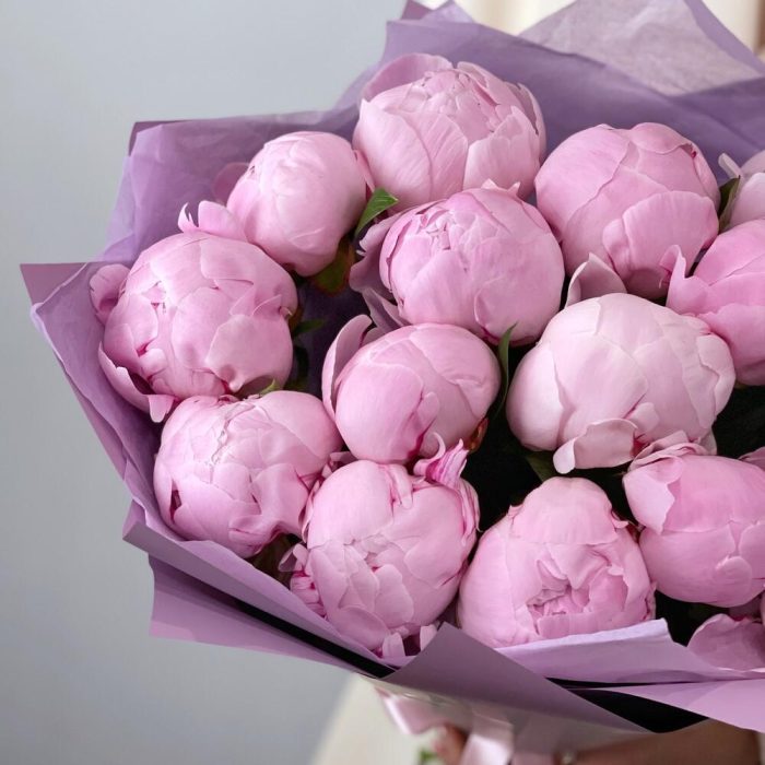 Букет из шикарных ароматных розовых пионов сорта Сара Бернар.Пионы распускаются еще в вазе и будут радовать до 5-7 дней.Степень раскрытия пионов всегда разная, мы можем гарантировать со своей стороны свежесть цветов.К каждому букету мы прикладываем:- открытку с Вашими пожеланиями- инструкцию по уходу за букетом- пакетик кризала для продления жизни цветов