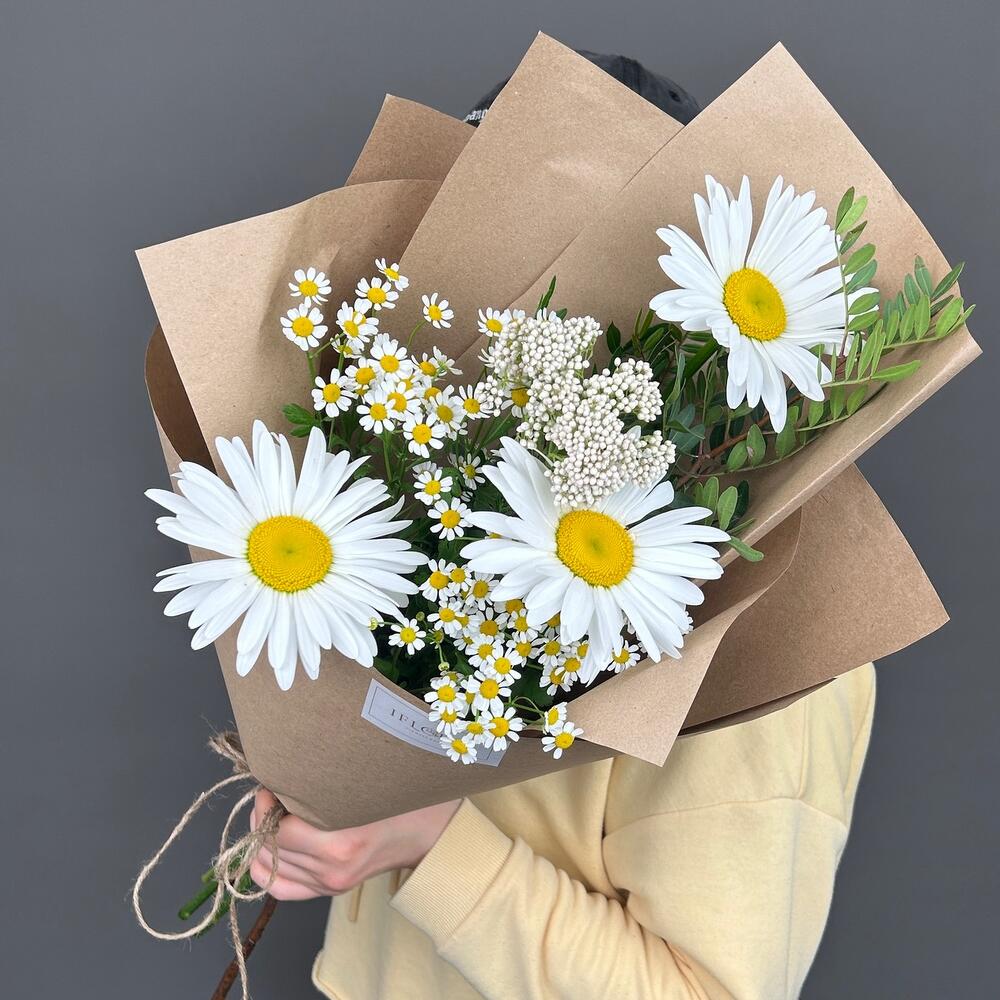 ромашки – 3 шт.Танацетум – 2 шт.Озотамнус – 1 шт.листья фисташки – 1 шт.Дизайнерская упаковка – 2 шт.
