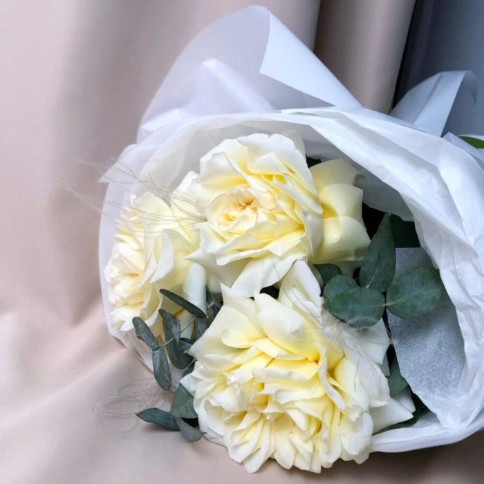 Эвкалипт – 3 шт.Лента атласная – 1 шт.Роза французская – 3 шт.Ковыль – 3 шт.пленка флористическая – 3 шт.подкормка для стойкости цветов – 1 шт.открытка для пожеланий – 1 шт.