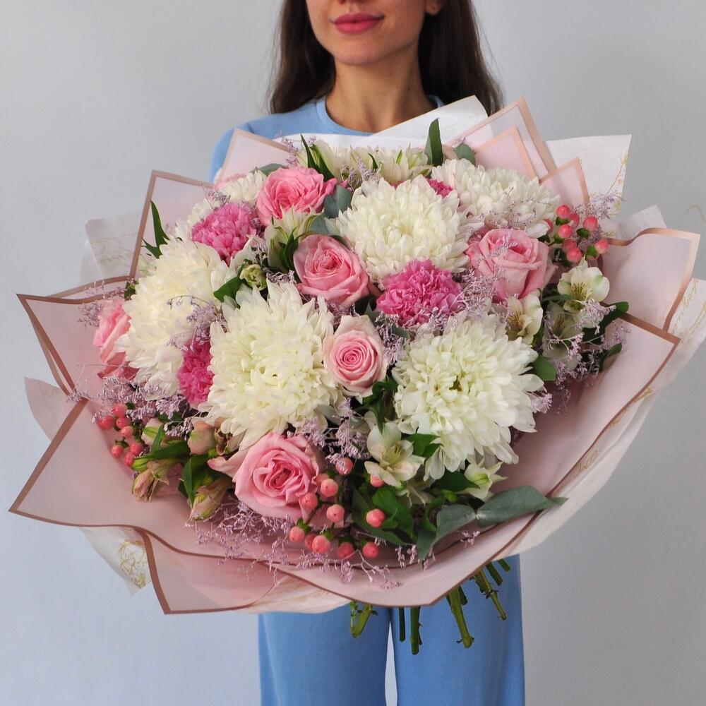 Белые хризантемы и розы в букете «Твоя Нежность»