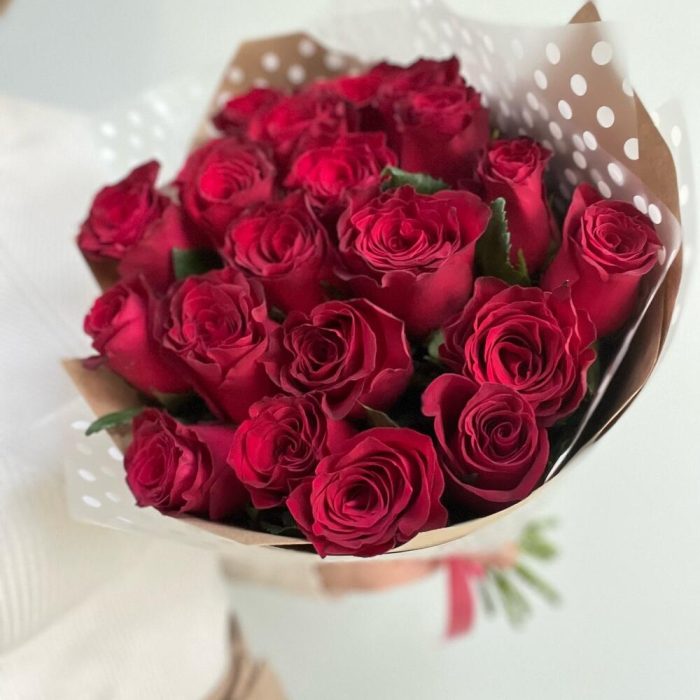 цветы роза – 21 шт.Упаковка крафт – 2 шт.Пленка дизайнерская – 2 шт.