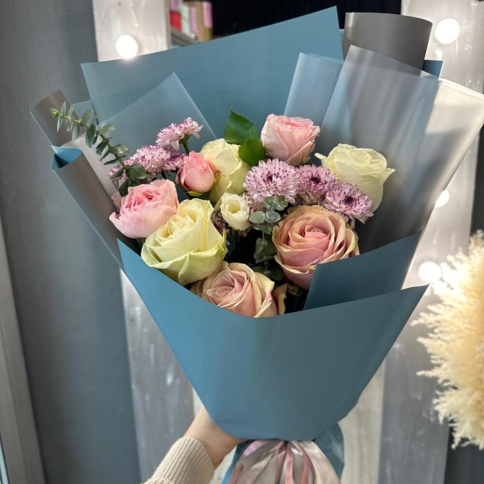 Роза – 5 шт.Сантини – 3 шт.Роза кустовая – 1 шт.Рускус – 1 шт.Эвкалипт – 2 шт.Упаковка дизайнерская – 4 шт.