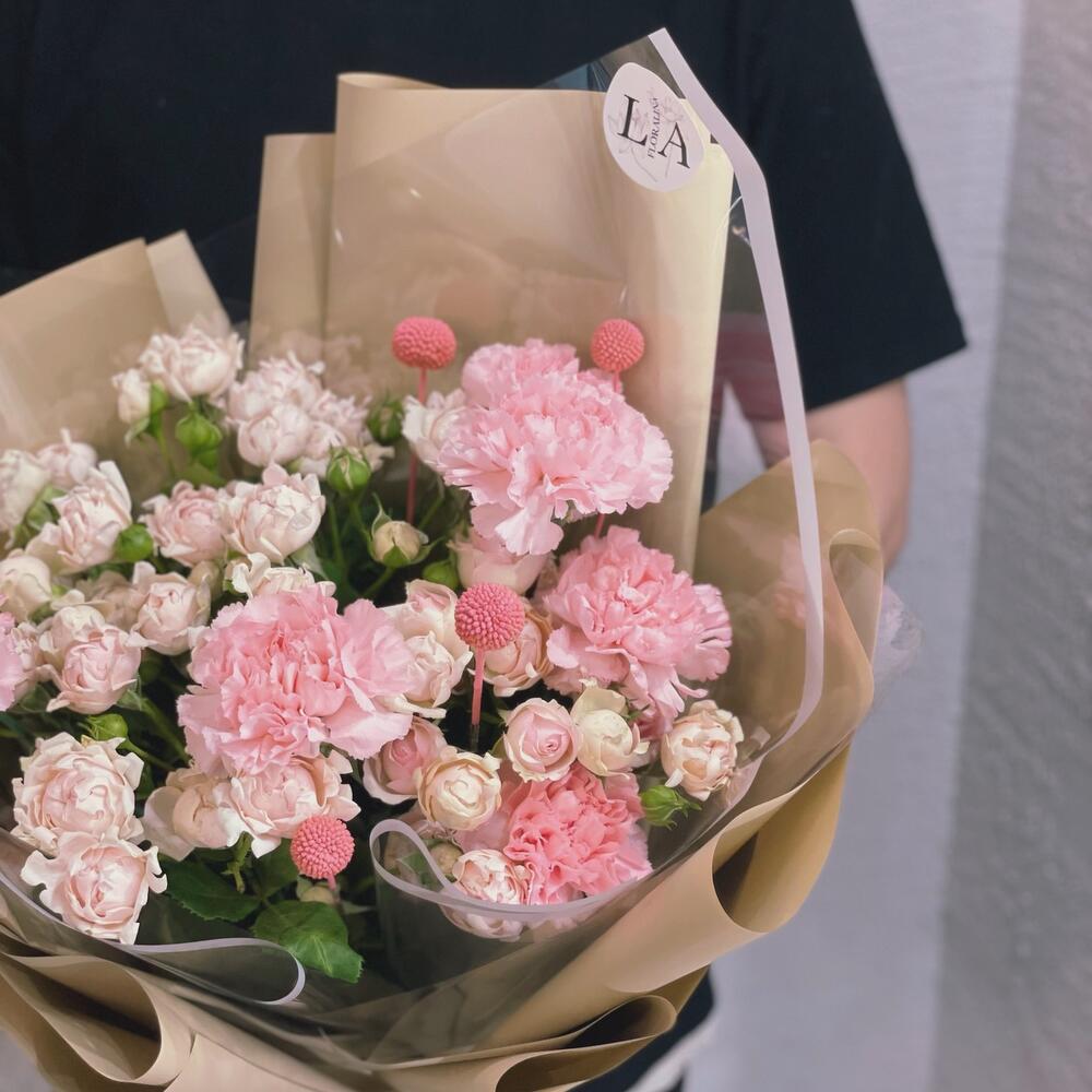 Краспедия – 4 шт.Кустовая роза – 8 шт.Гвоздика – 7 шт.Лента атласная – 2 шт.Упаковка дизайнерская – 5 шт.