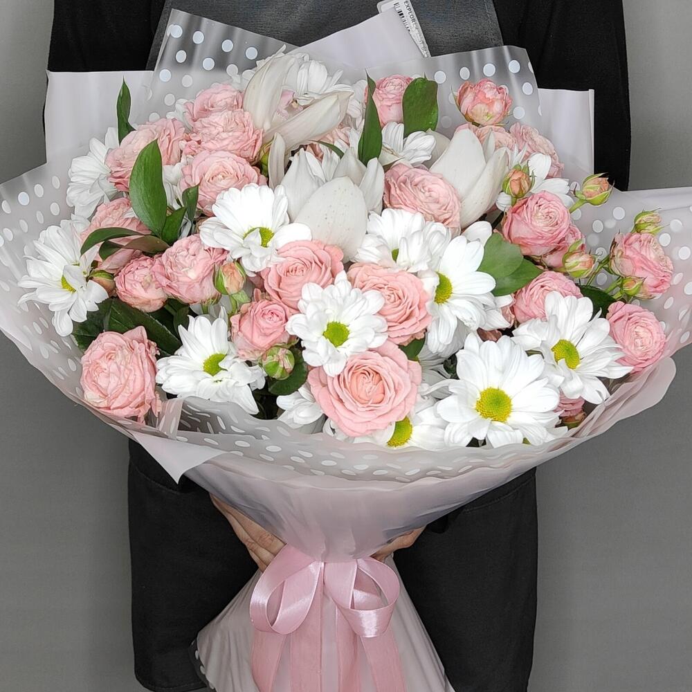 Букет из кустовой розы нежного цвета и ромашек