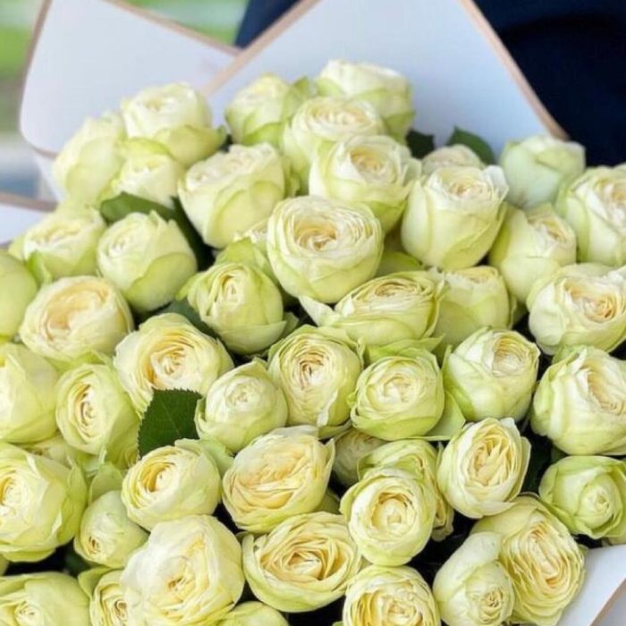 розы пионовидные белые – 65 шт.Упаковка дизайнерская – 2 шт.Лента атласная – 2 шт.Открыточка с вашими пожеланиями – 1 шт.хорошее настроение – 100 шт.инструкция по уходу за цветами – 1 шт.коробка переноска – 1 шт.Кризал – 1 шт.