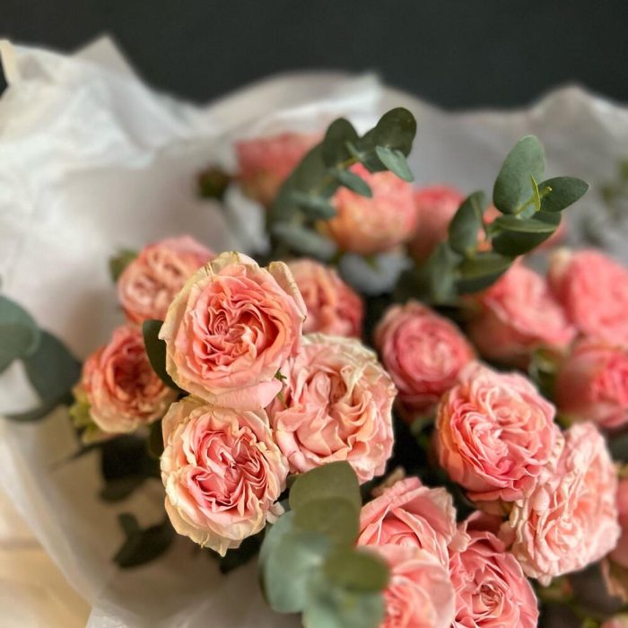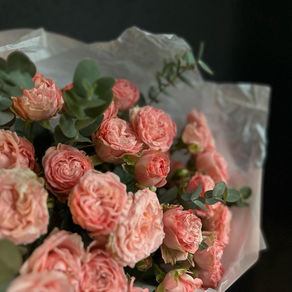 Кустовая пионовидная роза – 7 шт.Эвкалипт – 9 шт.декоративная упаковка – 1 шт.Атласная лента – 1 шт.