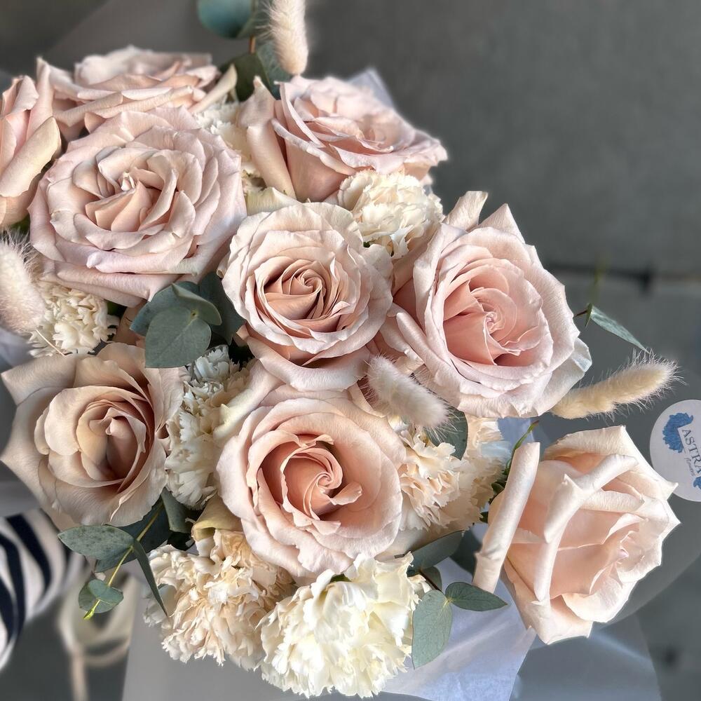 Гвоздика кремовая – 7 шт.Эвкалипт – 1 шт.Атласная лента – 1 шт.Лагурус (сухоцвет) – 4 шт.Авторская упаковка – 1 шт.квиксенд роза – 9 шт.