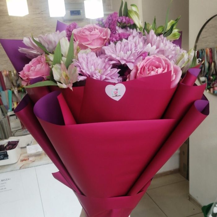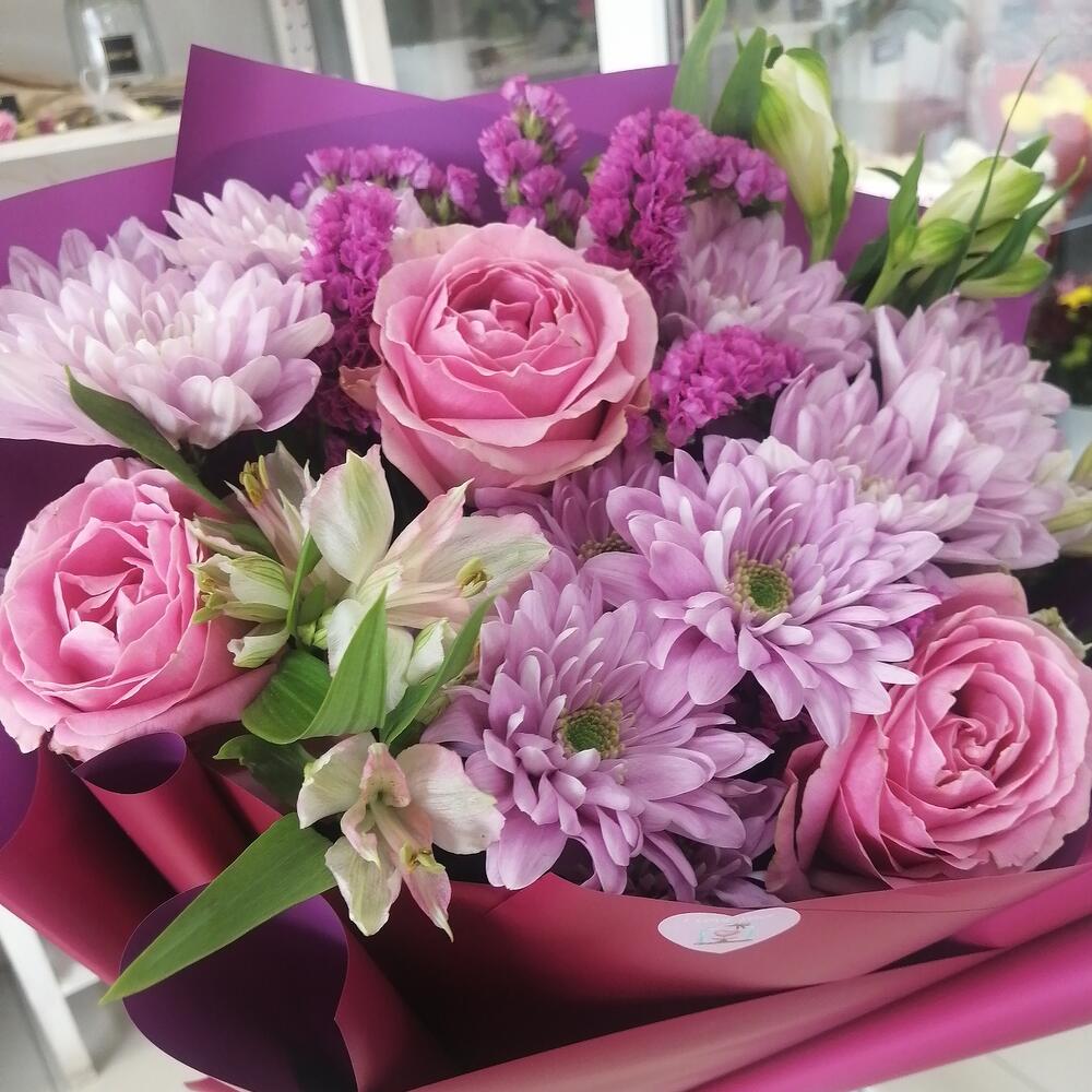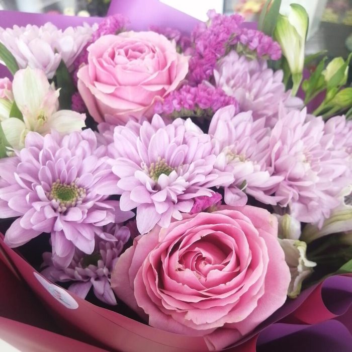 Букет ароматных роз, хризантемы и лилового лимониума "Нежность"