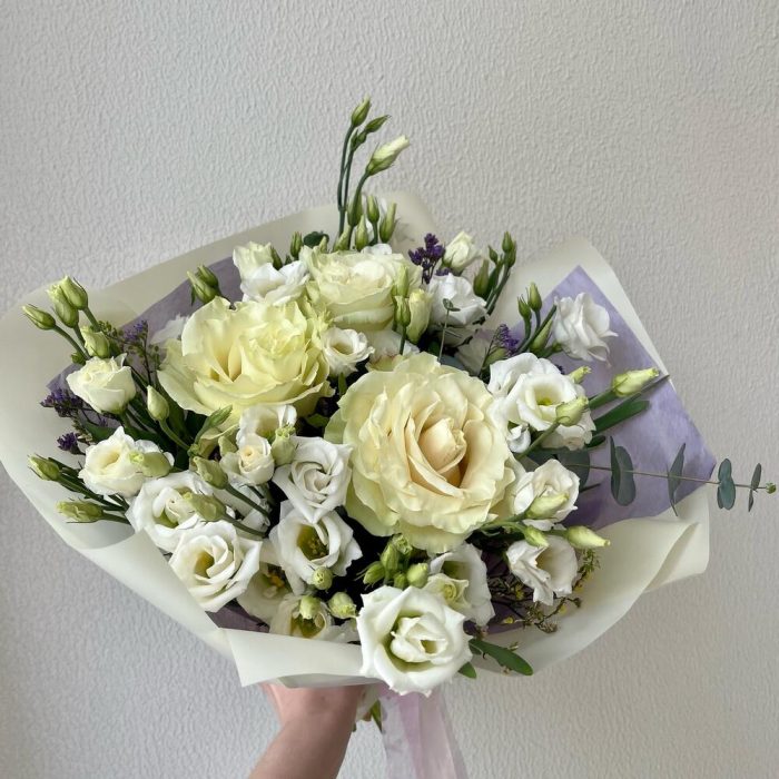 Лизиантус – 5 шт.Роза – 3 шт.Лимониум – 3 шт.Эвкалипт – 1 шт.