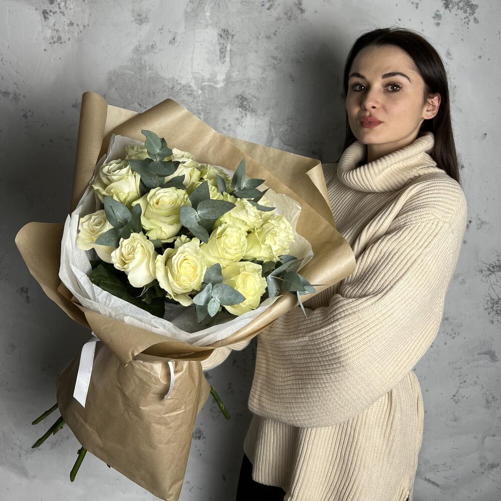 Роза мондиаль 60 см – 15 шт.Эвкалипт – 5 шт.Упаковка дизайнерская – 3 шт.Лента атласная – 1 шт.