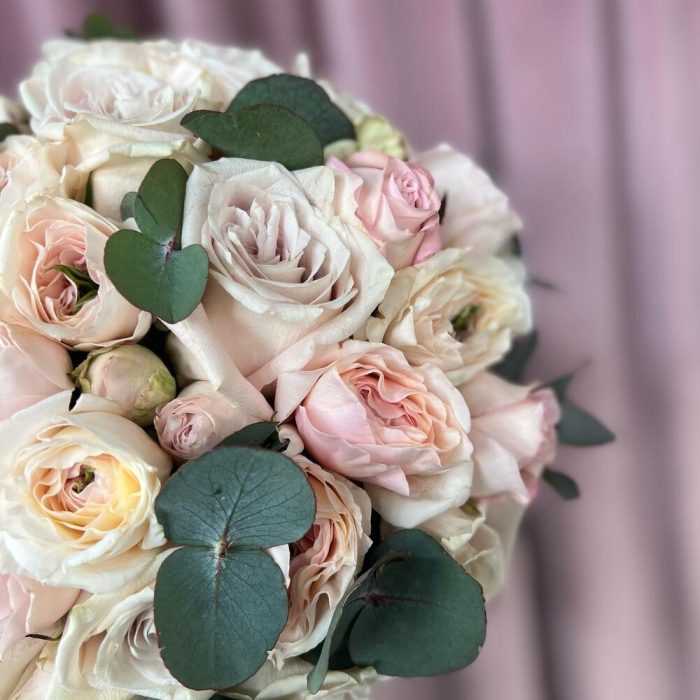 Эвкалипт – 3 шт.Пионовидная роза – 9 шт.Атласная лента – 2 шт.Кустовая пионовидная роза – 7 шт.Одноголовая роза – 13 шт.