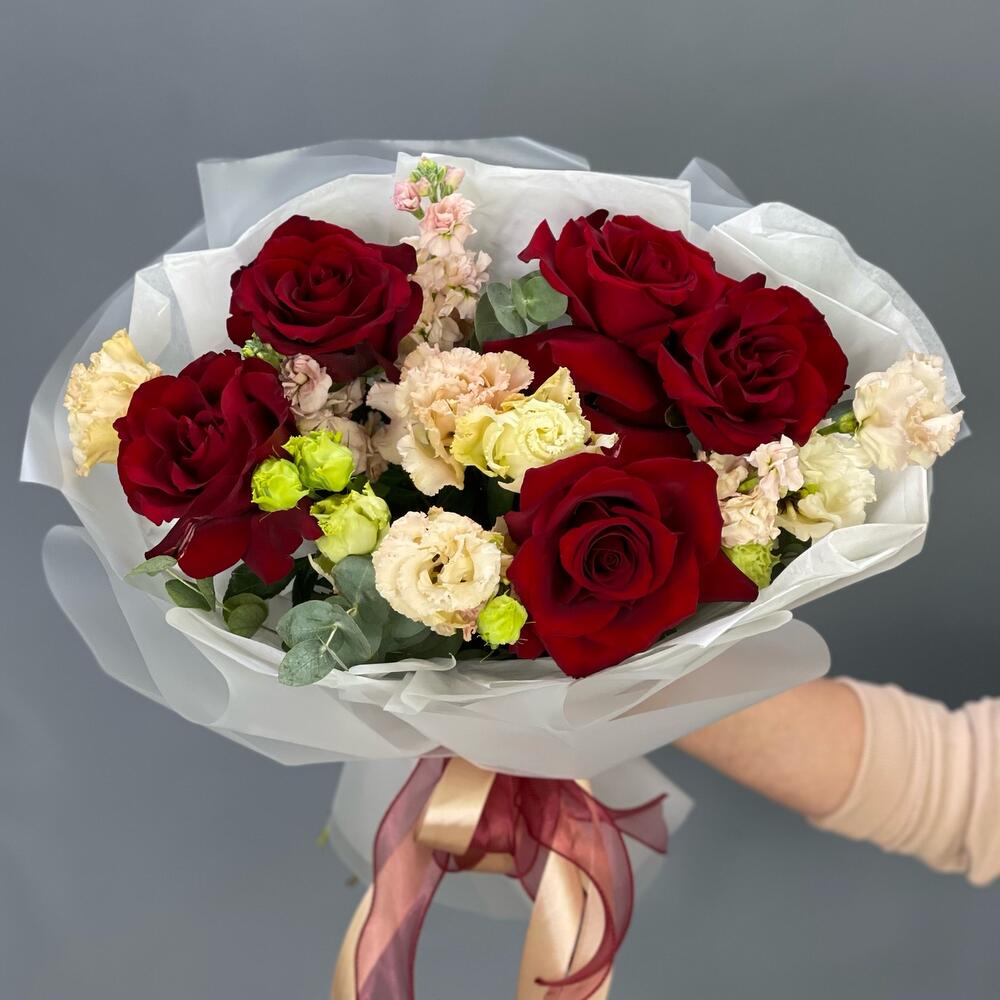 Лента – 1 шт.Лизиантус – 2 шт.Маттиола – 3 шт.Эвкалипт – 1 шт.Упаковка – 1 шт.Тишью – 2 шт.Роза французская – 5 шт.