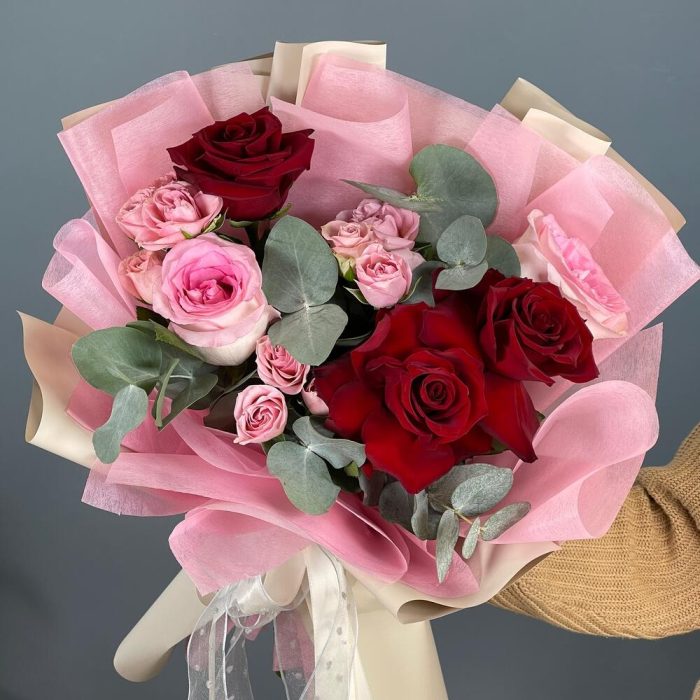 Роза одноголовая – 5 шт.Роза кустовая – 3 шт.Эвкалипт – 2 шт.Упаковка дизайнерская – 2 шт.Лента – 2 шт.