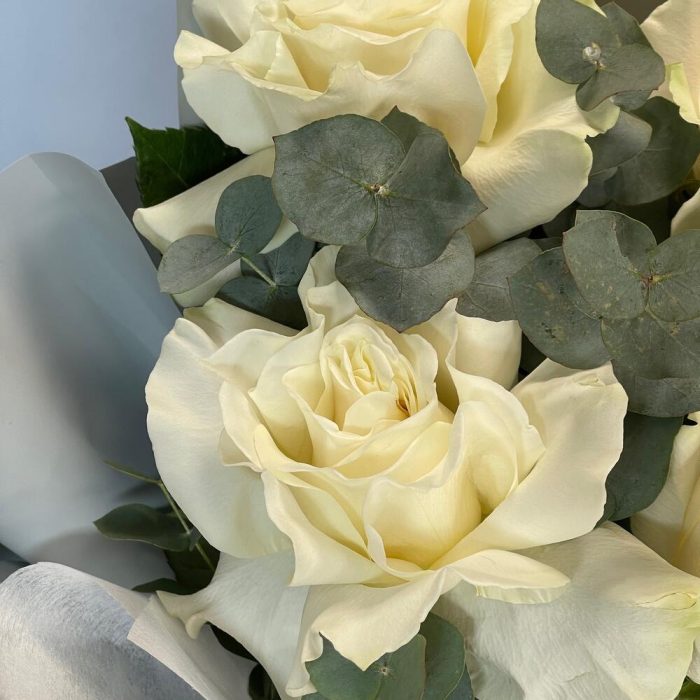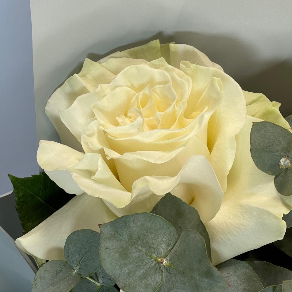 Роза одноголовая – 5 шт.Эвкалипт – 2 шт.Упаковка дизайнерская – 2 шт.Лента – 2 шт.