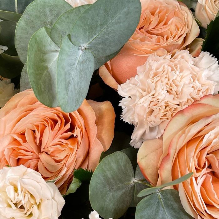 Букет с розами и лизиантусами “Персиковый джем”