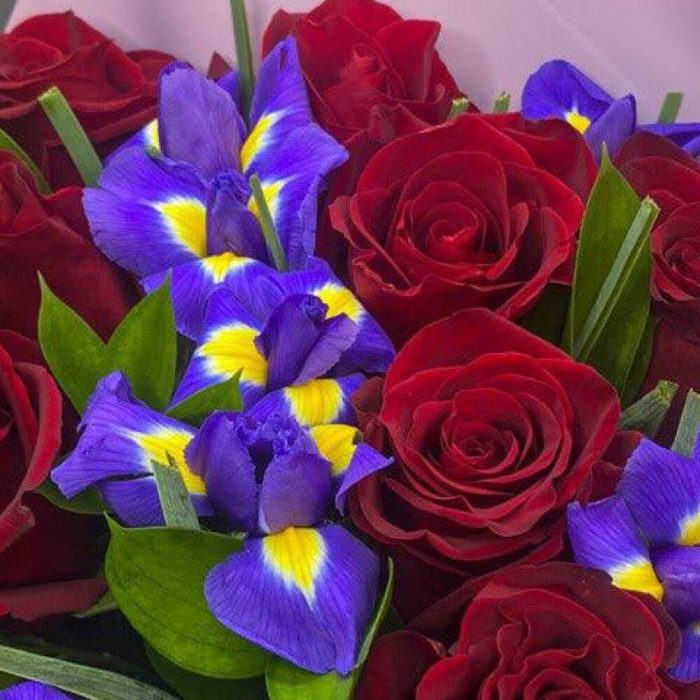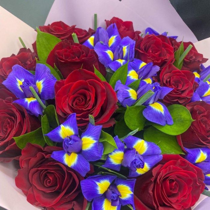 Ирис – 12 шт.Лента – 1 шт.Роза – 13 шт.Зелень – 10 шт.Упаковка – 1 шт.