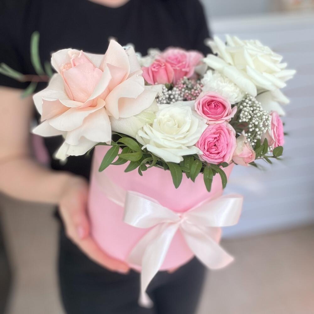 Кустовая роза – 2 шт.Зелень – 5 шт.Лента атласная – 1 шт.Роза белая – 2 шт.Шляпная коробка – 1 шт.Флористическая губка – 1 шт.Открыточка с вашими пожеланиями – 1 шт.Диантус белый – 1 шт.Диантус розовый – 1 шт.зелень экзотика – 3 шт.роза ажурная белая – 1 шт.роза ажурная нежно розовая – 1 шт.