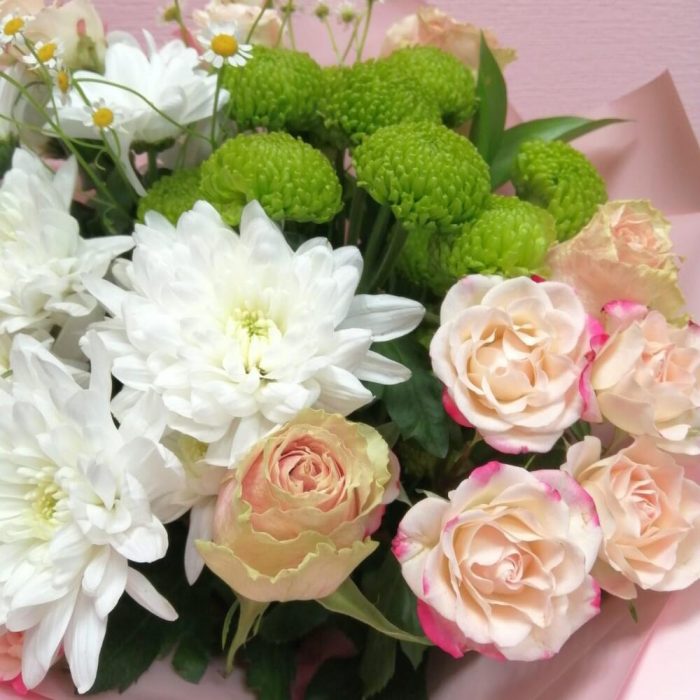 Лента – 1 шт.Роза кустовая – 3 шт.Хризантема кустовая – 3 шт.Роза – 3 шт.Упаковка – 1 шт.Матрикария – 1 шт.Фисташка – 1 шт.