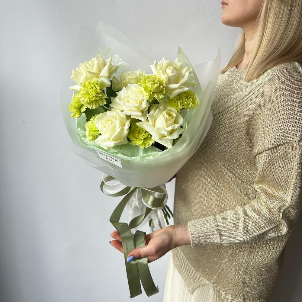 Роза – 7 шт.Фисташка – 3 шт.Упаковка дизайнерская – 3 шт.Диантус – 7 шт.
