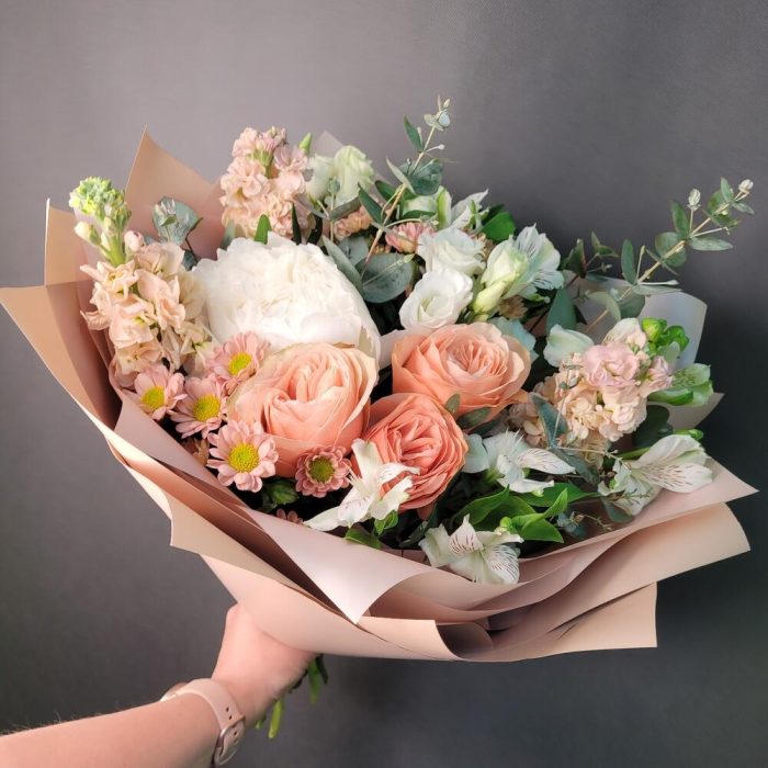 Роза Эквадор – 3 шт.Маттиола – 3 шт.Пион – 1 шт.Альстромерия – 3 шт.Сантини – 2 шт.Эустома – 2 шт.Эвкалипт – 2 шт.Упаковка дизайнерская – 1 шт.Лента атласная – 1 шт.