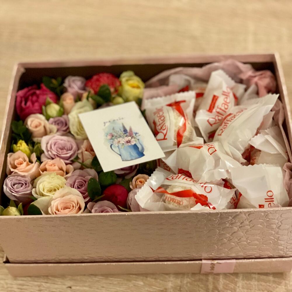 Аккуратная коробочка из цветов и вкусных конфет с кокосовой начинкой. Цветы помещены в специальную губку, поэтому не требуют никакого специального ухода. По вашему желанию и за небольшую доплату можем заменить конфеты на любимые получателя. Сообщите о намерении при заказе